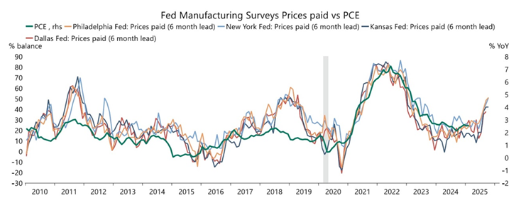 Firms’ reactions and rising prices / inflation: Companies are increasingly passing tariff-induced cost hikes to consumers, contributing to expected inflationary pressures over the next six months (OW analysis, Apollo)