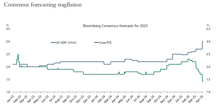 Oliver Wyman analysis, Apollo, 3rd May 2025)Since the onset of the trade war in March, there has been a notable revision in economic forecasts. Growth expectations have decreased, while inflation expectations have increased (as reflected above), indicating the onset of stagflation—characterized by higher inflation coupled with lower growth