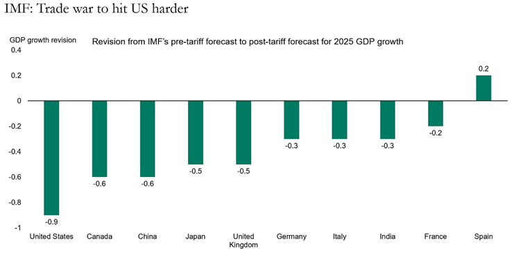 Apollo, 8th May 2025The IMF just released their latest World Economic Outlook, and comparing their pre-tariff forecast from January with their forecast today shows that they expect the trade war to have a much bigger negative impact on the US economy than on other countries, including China, see chart below