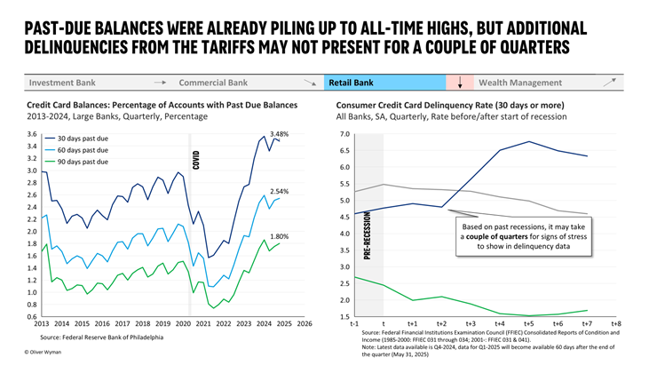 OW Analysis Delinquencies are rising from already elevated levels, but the full fallout from tariff-driven inflation and 40-year-high card APRs may take several quarters to materialize.